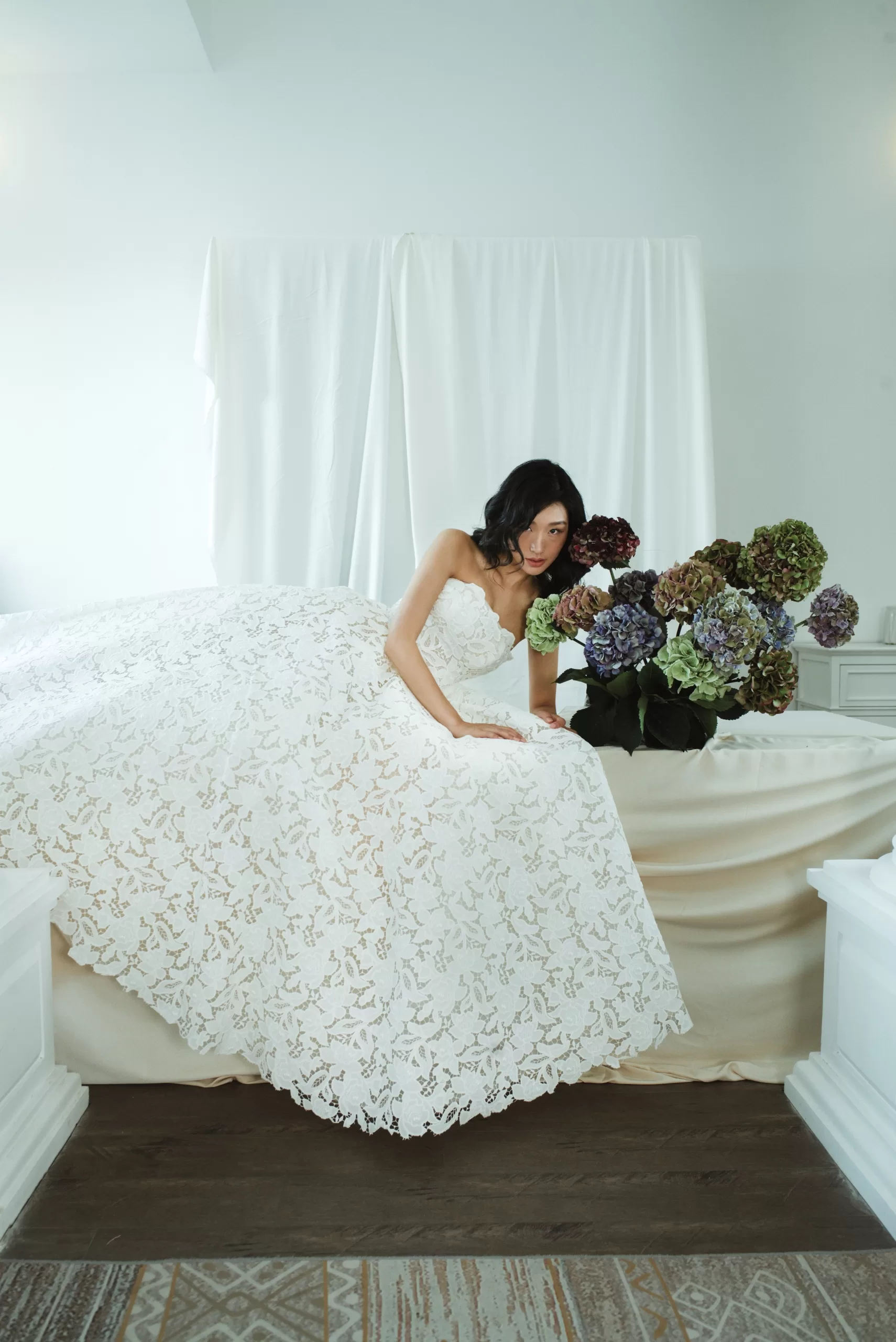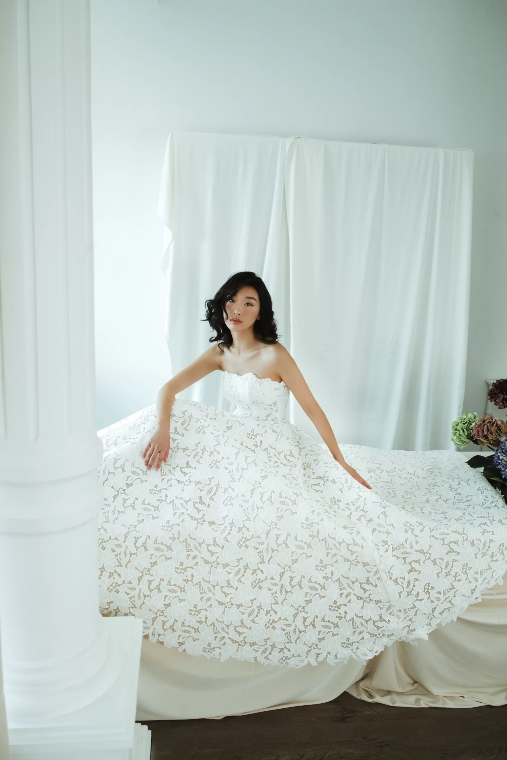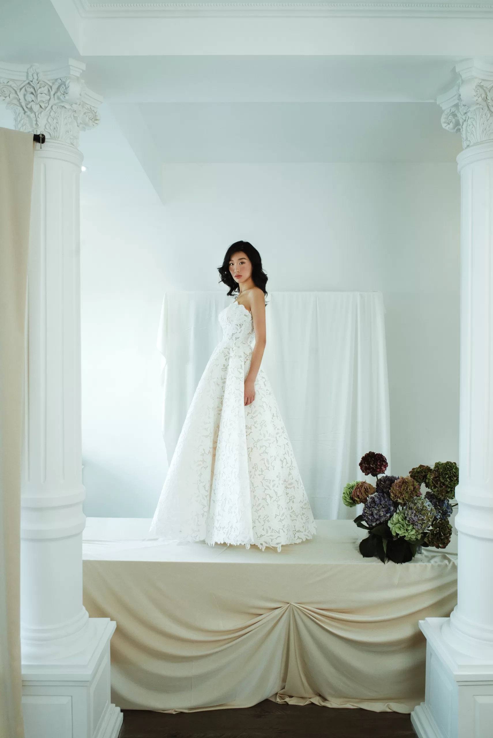 Váy cưới với thiết kế cúp ngực thanh lịch, điểm nhấn là họa tiết ren tinh xảo được đính