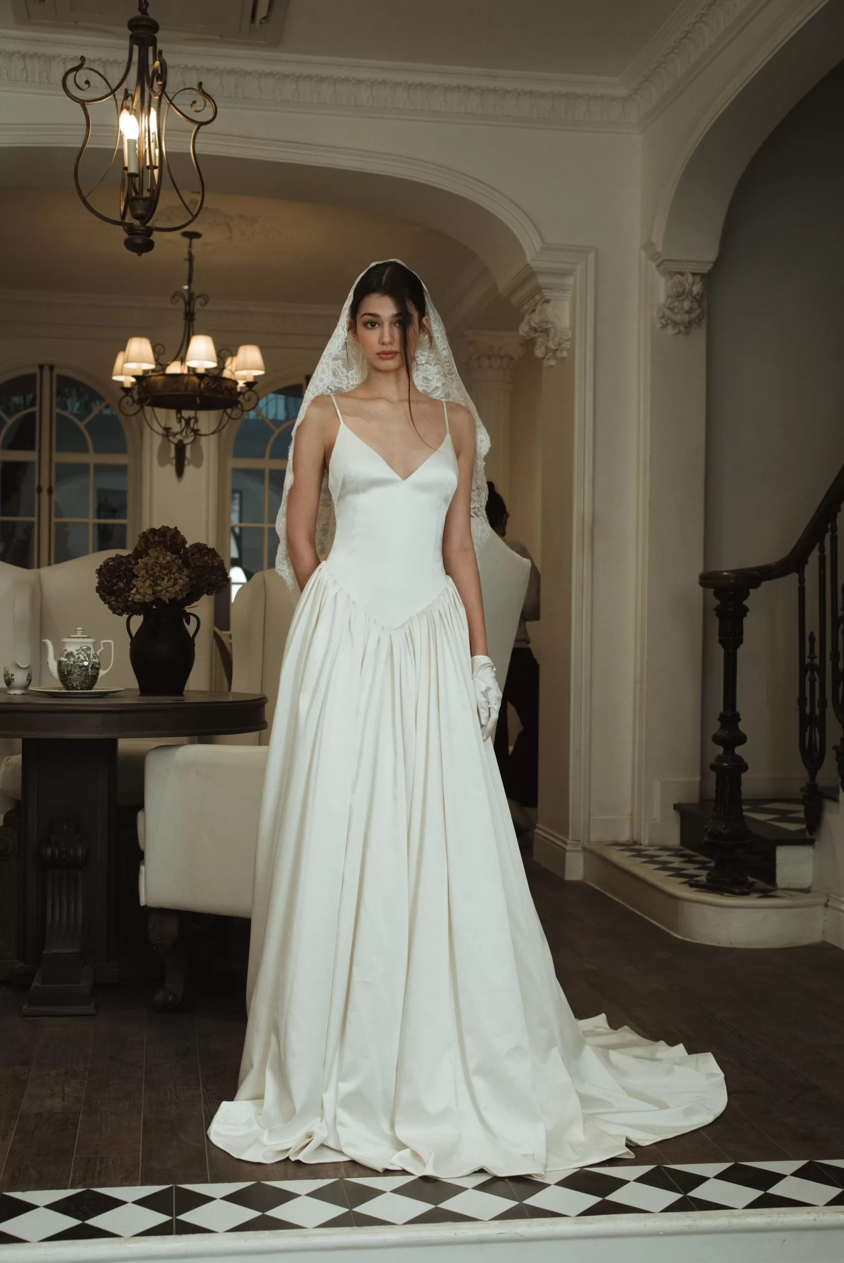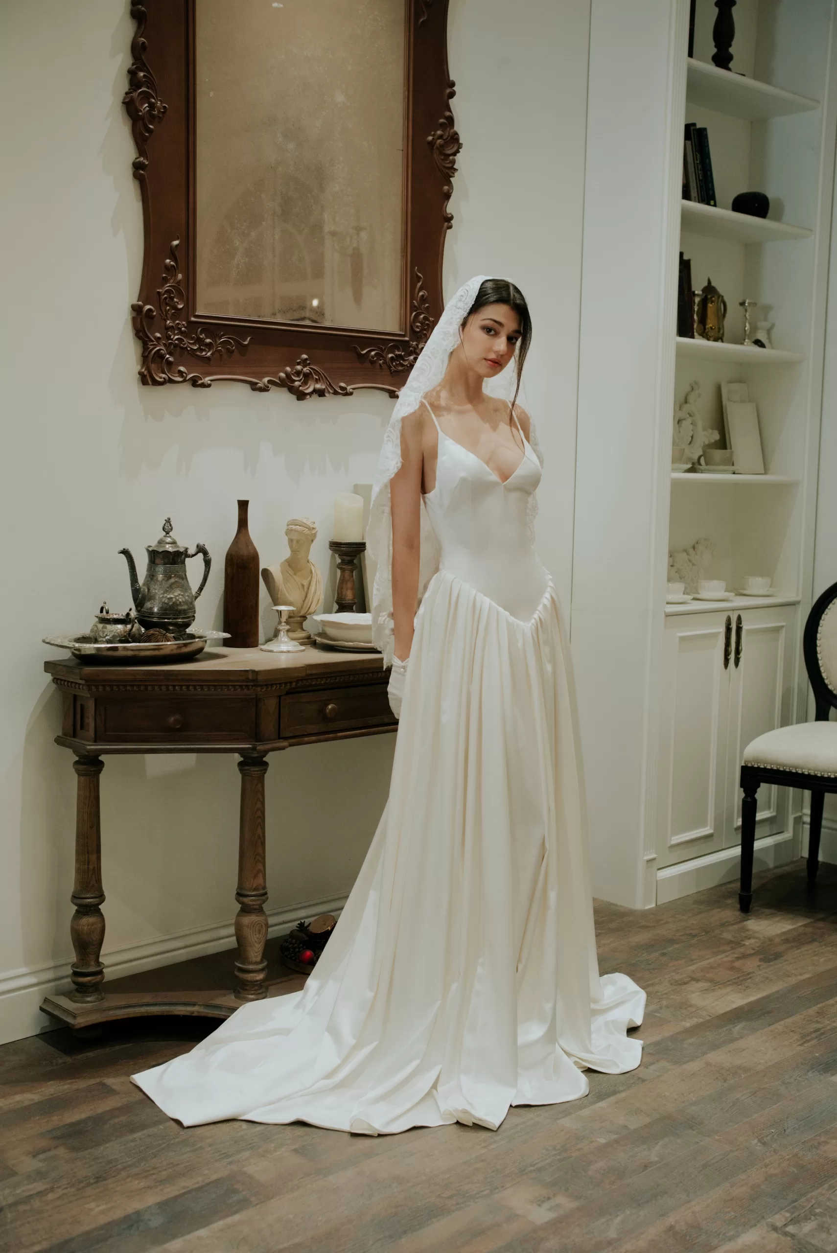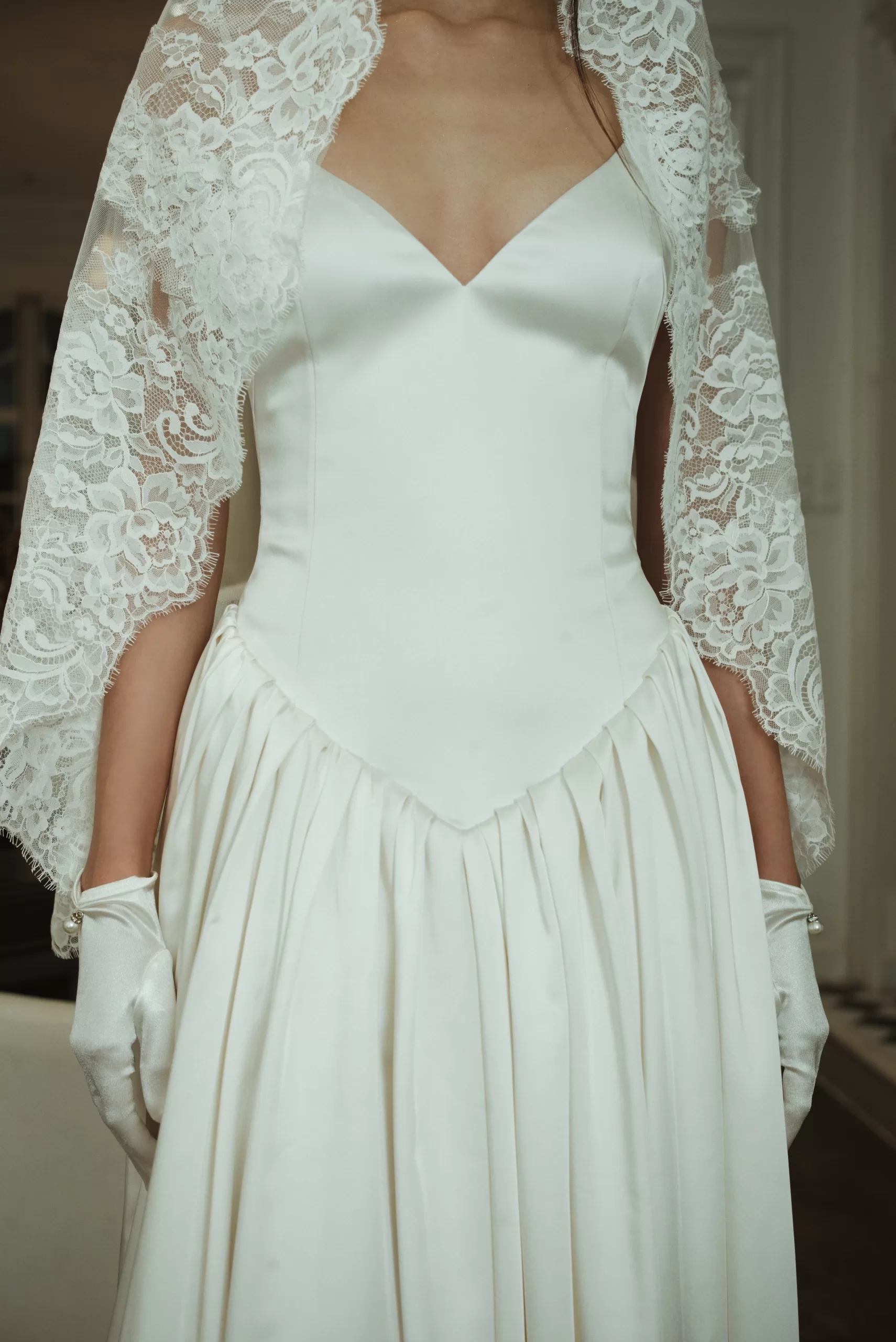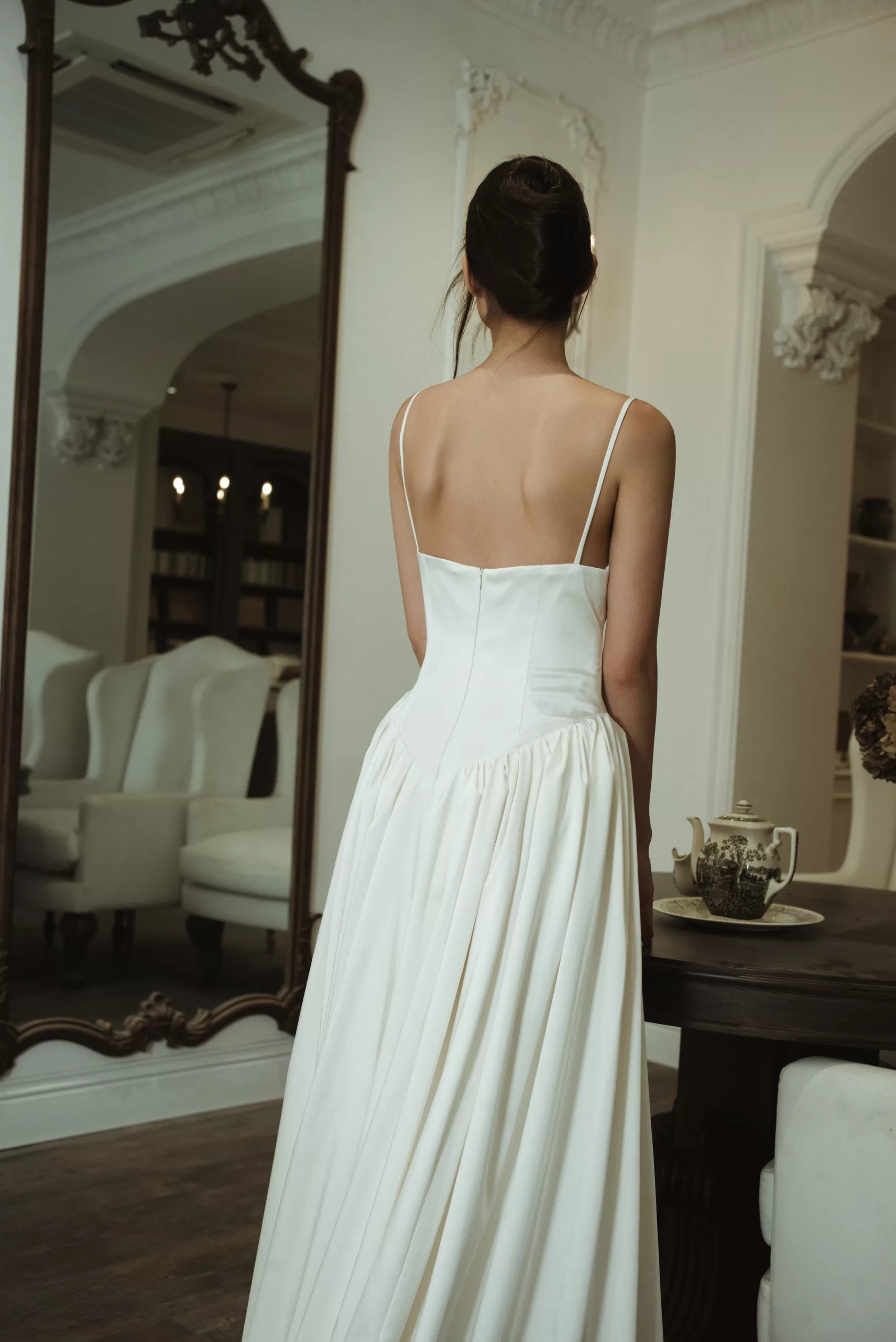 Thiết kế váy cưới hai dây trên nền lụa óng ả, ôm trọn đường cong cơ thể với nếp gấp