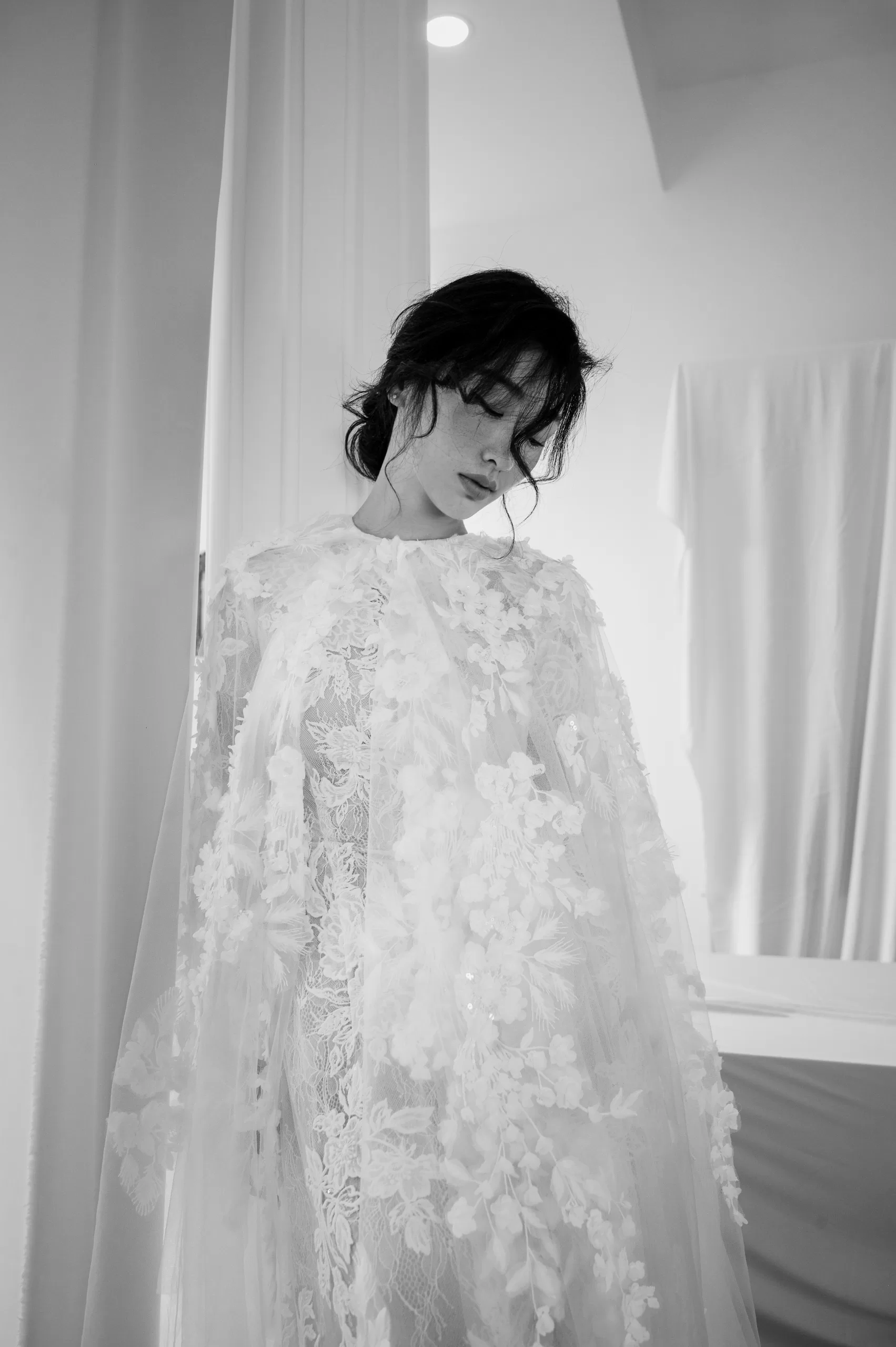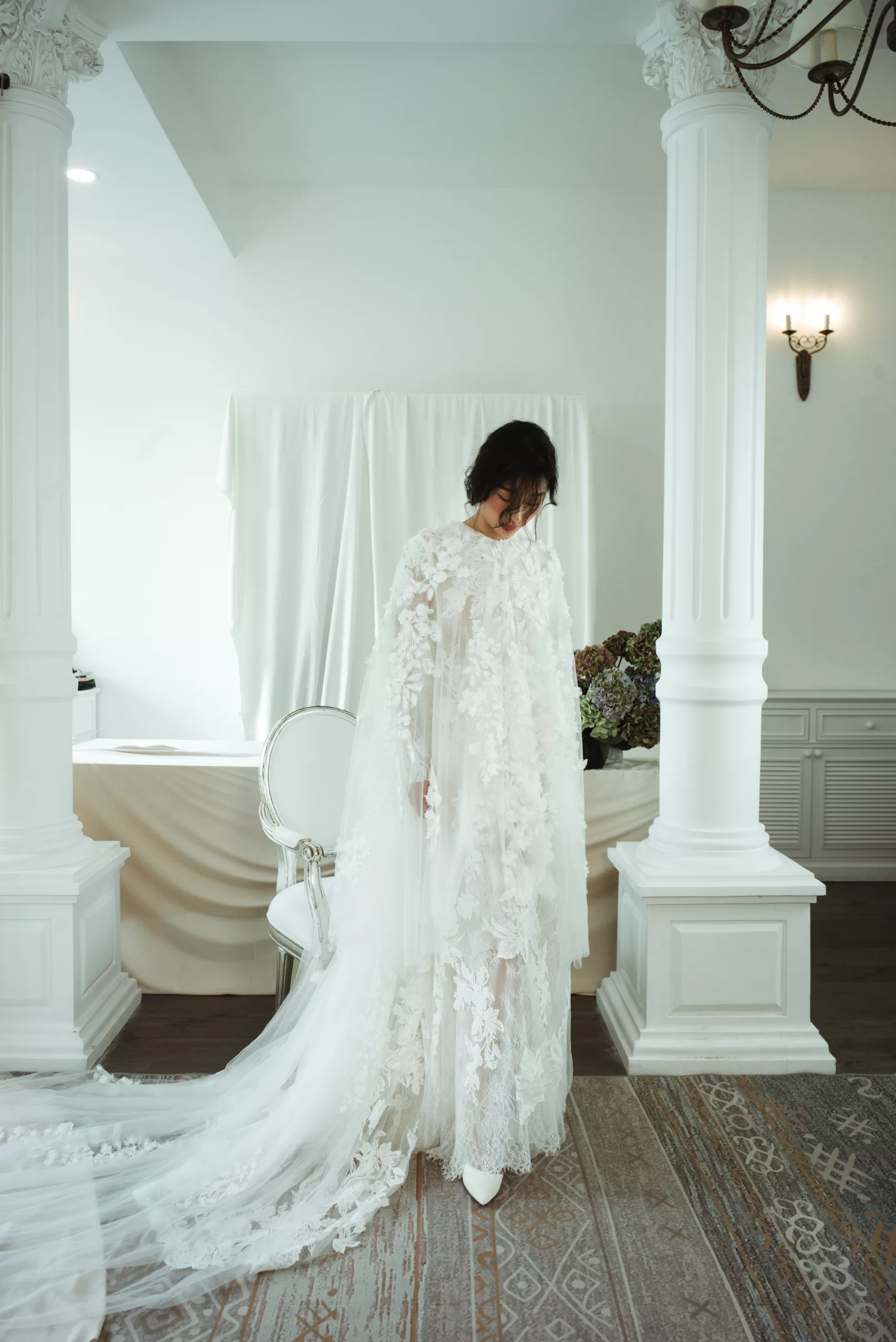 bí ẩn. Cô dâu có thể kết hợp cùng áo choàng dài để tăng vẻ uyển chuyển, hoặc diện